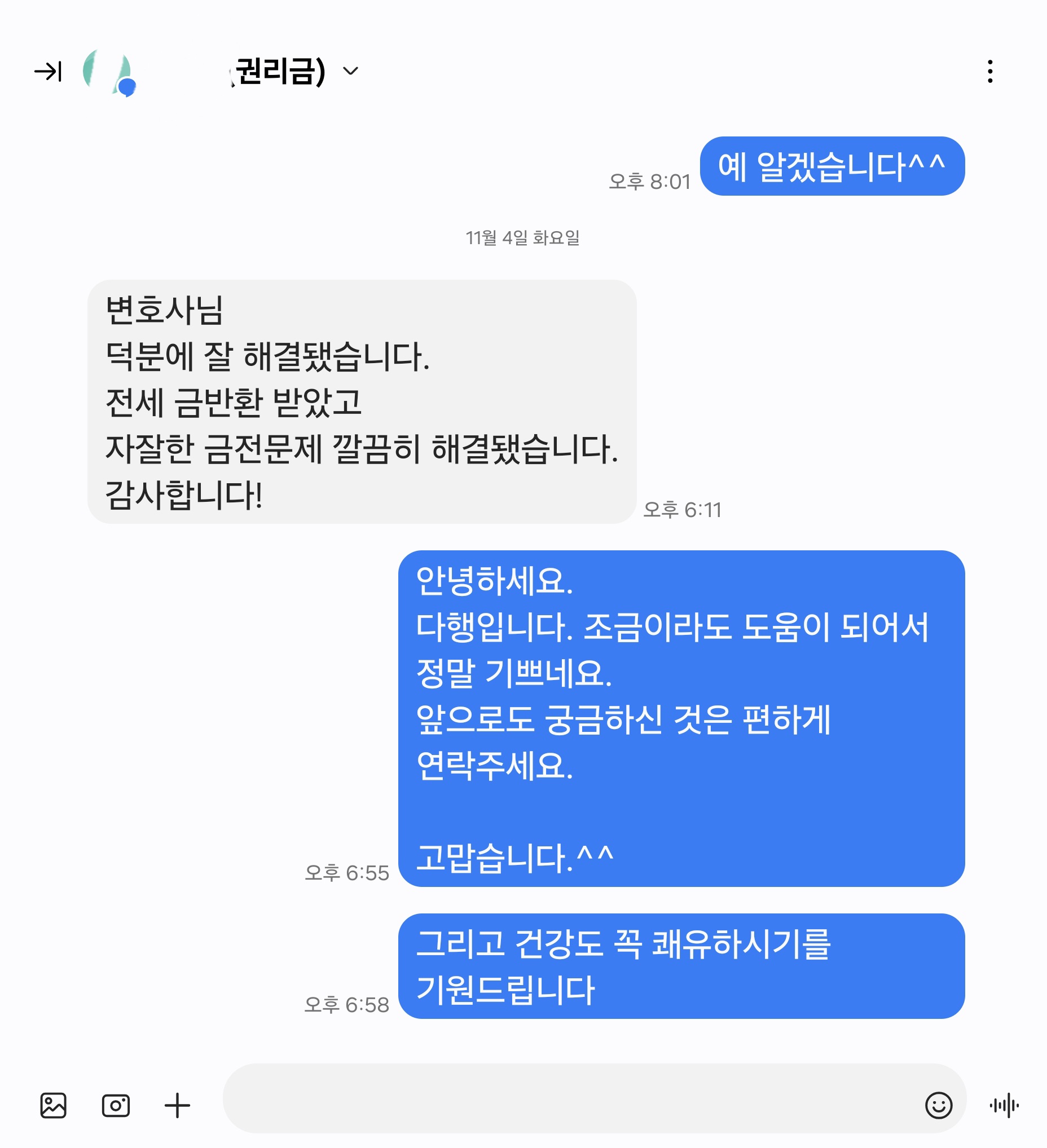 얼마전에도 전세보증금 반환건으로 상담해주신 분에게 힘이 나는 문자를 받았습니다.